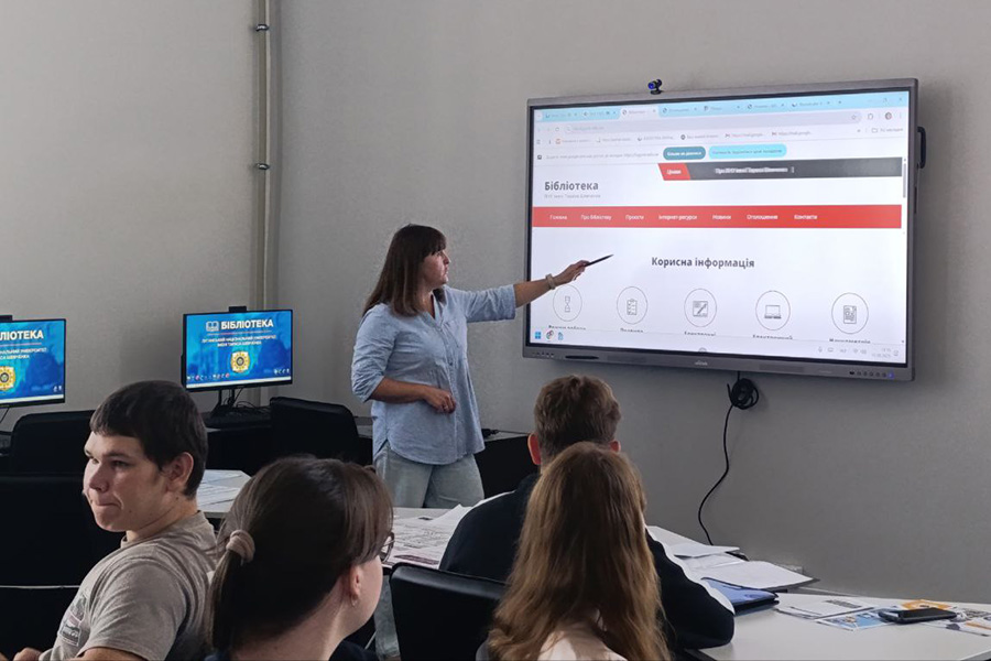 Провідна бібліотекарка, Оксана Шевчик, розповіла про можливості бібліотеки та послуги, які вона може надавати. Обговорювалися питання доступу до електронних каталогів, міжнародних наукових баз даних, університетської електронної бібліотеки та інших онлайн-ресурсів. Особливий акцент було зроблено на пошуку інформації для наукових робіт, курсових і дипломних проєктів.