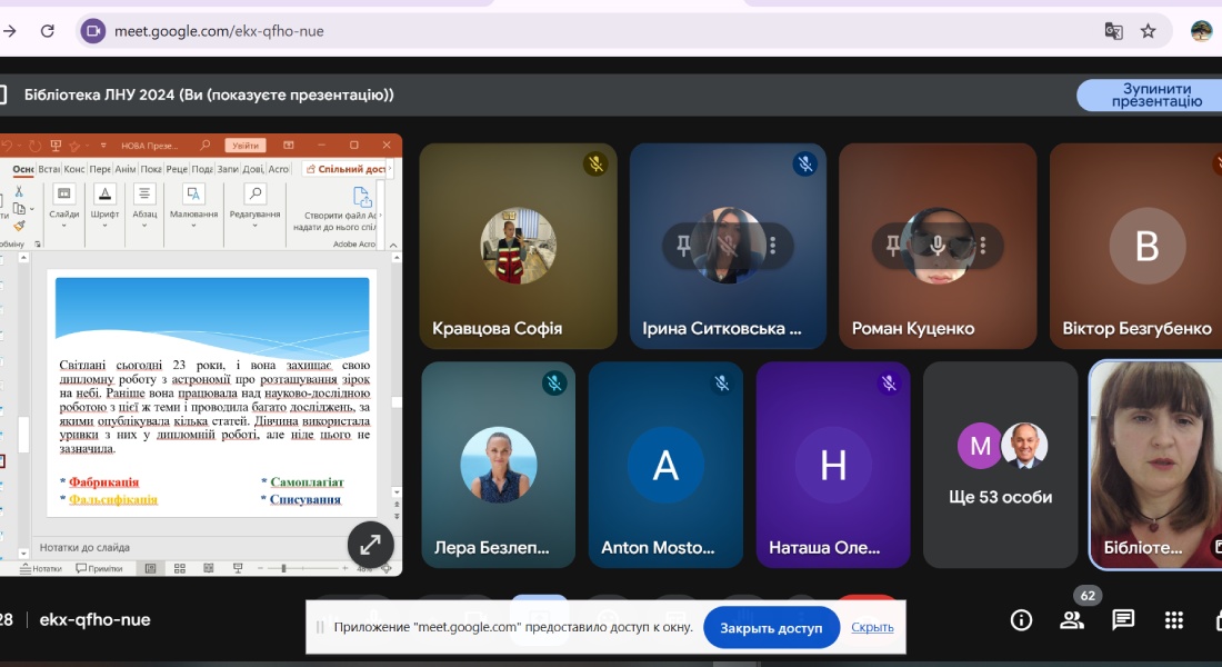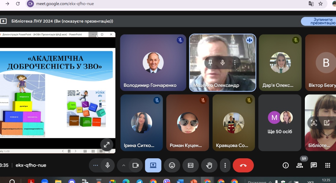 Завуч школи, Оксана Шевчик, познайомила присутніх із поняттям академічної доброчесності, її основними принципами та поширеними видами порушень. Учасники отримали інформацію про авторське право та використання програм для перевірки наукових робіт на плагіат. Було представлено стратегії уникнення плагіату та правила оформлення джерел, а також ключові нормативно-правові документи щодо академічної доброчесності на рівні держави й університету, зокрема, з Положенням про академічну доброчесність учасників освітнього процесу ДЗ «ЛНУ імені Тараса Шевченка».