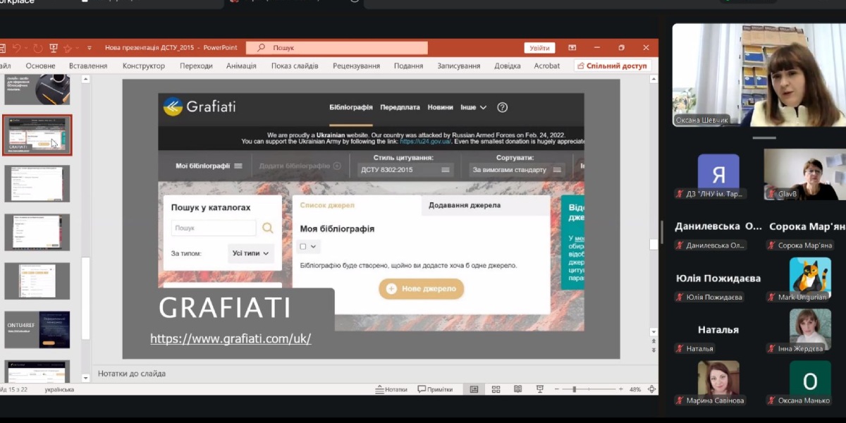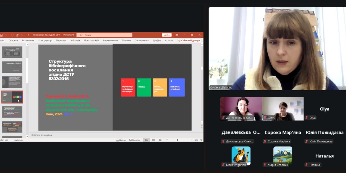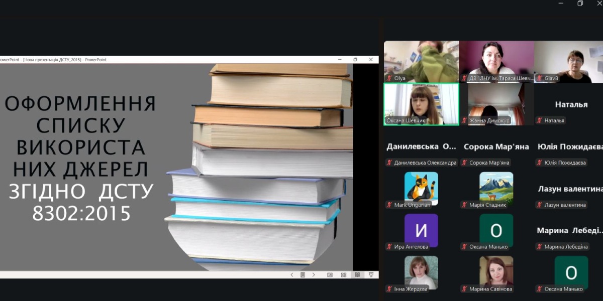 Працівники бібліотеки систематично організовують інформаційно-роз’яснювальні заходи для студентів та співробітників університету. У межах цієї діяльності 16 жовтня було проведено інформаційно-ознайомчий вебінар для здобувачів освіти кафедри соціальної педагогіки навчально-наукового інституту педагогіки і психології. Темою зустрічі стало «Оформлення бібліографічних посилань у списку використаних джерел відповідно до стандарту ДСТУ 8302:2015».