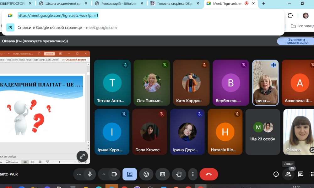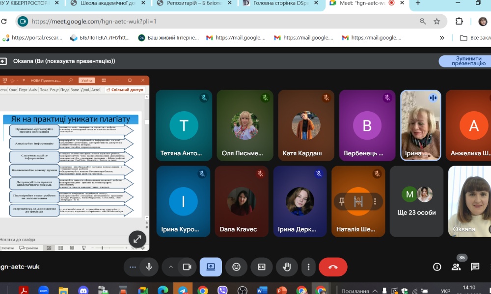 Під час зустрічі обговорили поняття чесності, доброчесності та академічної доброчесності як основи якості освіти й довіри до результатів навчання. Здобувачі були ознайомлені з видами порушень академічної доброчесності та відповідальністю за них. Студентам надали практичні поради щодо уникнення плагіату, захисту авторського права і методики їх запобігання. Також, студентів ознайомили з цифровим репозиторієм університету, можливостями доступу до міжнародних наукометричних баз даних, який надає бібліотека.