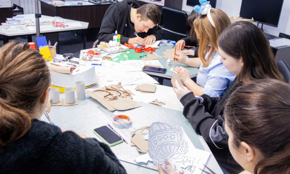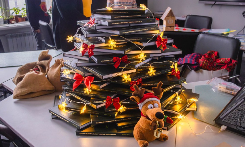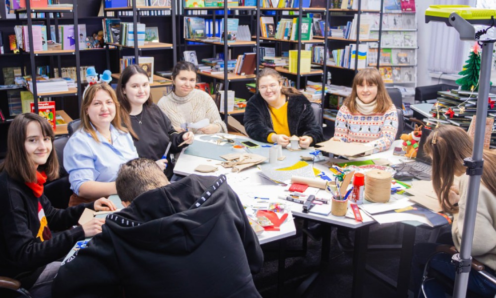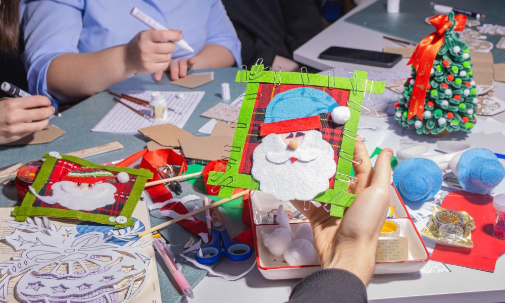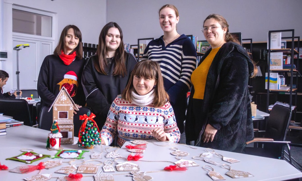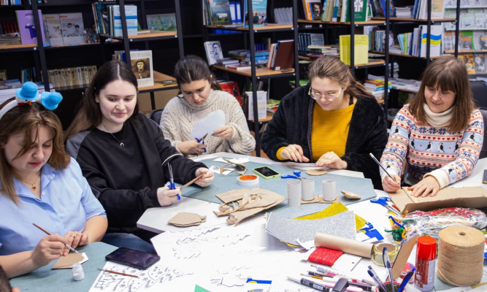 Учасники власноруч виготовляли новорічні прикраси, вирізали креативні гірлянди й витинанки, створювали святкові композиції та святкові елементи декору. Справжньою зіркою заходу стала незвичайна ялинка з книг — символічне поєднання зимової магії, любові до читання та університетських традицій, знань і творчості.