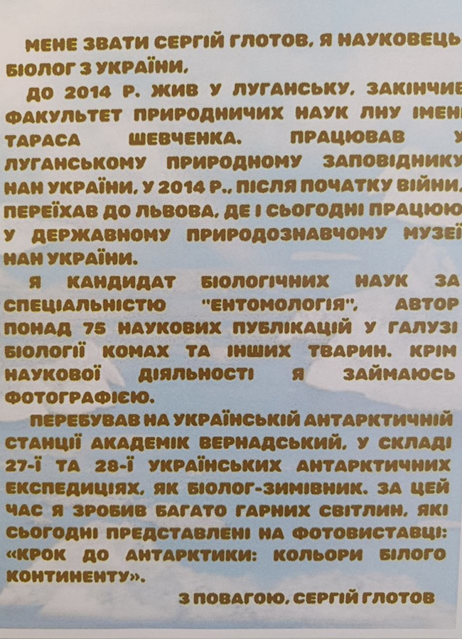 На базі бібліотеки університету відкрилася фотовиставка Сергія Глотова, кандидата біологічних наук, учасника Українських антарктичних експедицій, випускника ЛНУ та викладача кафедри садово-паркового господарства та екології.